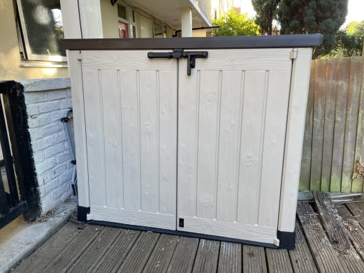 DetailEasy to assemble and easy to use, the global best-selling Store-It-Out MAX provides an ideal outdoor storage solution for everything from barbecues to outdoor furniture. Amazingly compact and versatile, this weather-resistant storage unit will keep up to 1200 L/42 cu.ft. of contents fresh and dry. For your convenience, it features front and top opening, a sloped threshold and bin-opening kit.Features and BenefitsIdeal outdoor storage solution for garden tools, equipment and x2 240 L wheelie binsElegant wood affect panels with a piston-assisted lid and wide opening doors and a 1200 L capacityHeavy-duty floor with main door bolt and secondary foot bolt for secure closureDurable, weather-resistant design - no maintenance or fadingAssembled external dimensions: 145.5 x 82 x 125 cm (L x W x H); internal dimensions: 132 x 76 x 110 cm (L x W x H)Item number: 254661